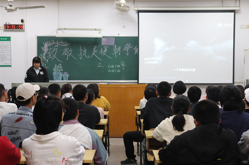 理论学习伊始,主持人围绕“为什么会爆发抗美援朝战争”“为什么要纪念抗美援朝战争”“抗美援朝战争留下了什么”这三个重要内容展开讲述,向同学们介绍了抗美援朝战争的历史背景和解秀梅、杨根思等英雄人物及其英勇事迹。随后,主持人向同学们展示了三封战士们在作战间隙写给亲人的家书,信中体现了战士们的国际主义情怀以及他们百折不挠的坚定意志。主持人通过引用习总书记在抗美援朝70周年纪念会上的重要讲话,激励同学们传承抗美援朝伟大精神,培养不被困难所压倒的自强品格和必胜信念。