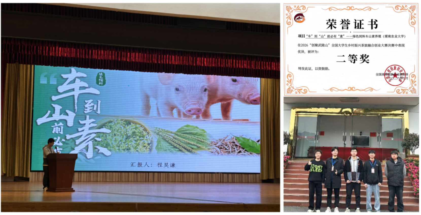 本次大赛吸引了来自剑桥大学、东京大学、清华大学等国内外顶尖高校团队同台竞技。由公司研究生程昊谦同学领衔(成员:蔡单伟,刘观清,李捷,赵允宝)的队伍,凭借项目“车到山前必有素——绿色饲料车山素”,立足农业专业优势,聚焦乡村养殖产业升级,创新性地将中草药研发、绿色饲料技术与武陵山片区实际需求相结合,其方案得到了评审专家的高度认可。