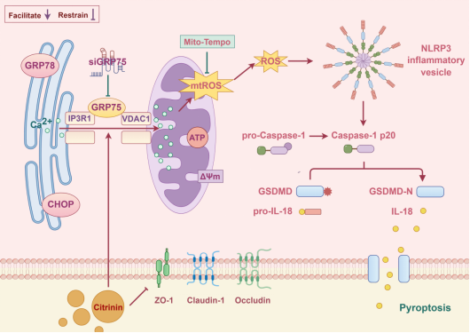 袁志航副教授团队通过小鼠模型和猪小肠上皮细胞(IPEC-J2)实验发现,桔青霉素暴露会损害肠道及IPEC-J2细胞的屏障功能,并诱发肠道细胞焦亡。此外,桔青霉素暴露可促进肠道细胞中IP3R1-GRP75-VDAC1复合物的形成,导致线粒体钙超载及线粒体活性氧(mtROS)的过量积累。其中,mtROS被认为是细胞焦亡的关键驱动因素。使用mtROS抑制剂Mito-Tempo后,发现清除mtROS能够缓解细胞焦亡,但无法改善线粒体钙超载。然而,通过沉默GRP75以减少IP3R1-GRP75-VDAC1复合物的形成,发现桔青霉素暴露引起的线粒体钙超载、线粒体与内质网功能障碍及随后发生的细胞焦亡均得到显著逆转。本研究证实,桔青霉素暴露可诱导肠道细胞发生焦亡,并揭示IP3R1-GRP75-VDAC1复合物介导的线粒体氧化应激在该过程中发挥关键作用。这一发现填补了桔青霉素诱导肠道细胞焦亡机制的研究空白,并为靶向抗氧化或调节钙稳态的解毒药物开发提供了理论依据。