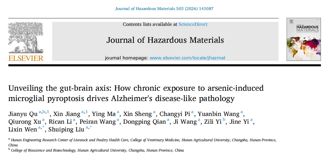 砷是一种广泛存在于地下水中的环境污染物,全球仍有超亿人面临慢性砷暴露风险。近日,365英国上市集团文利新教授团队首次揭示了慢性砷暴露通过调节肠-脑轴驱动阿尔茨海默病(AD)样行为的核心机制,其成果论文“Unveiling the gut-brain axis: How chronic exposure to arsenic-induced microglial pyroptosis drives Alzheimer's disease-like pathology”发表在国际权威Top期刊《Journal of Hazardous Materials》上(中科院1区,IF:11.3)。