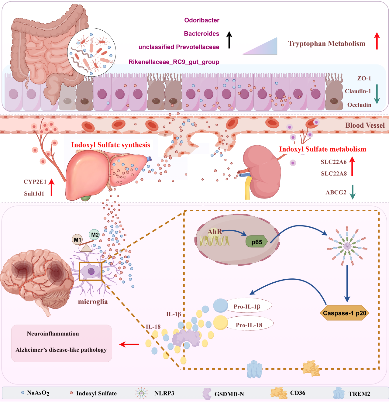 长期接触砷可能诱发记忆力下降和认知障碍,甚至增加阿尔茨海默病(俗称“老年痴呆”)的发病风险。本研究模拟低(50 μg/L)、中(150 μg/L)、高污染区(450 μg/L)地下水中砷的含量,构建6个月慢性砷暴露小鼠模型,团队研究证实:慢性砷暴露可导致小鼠认知功能障碍、脑部出现β-淀粉样蛋白(Aβ)沉积和Tau蛋白过度磷酸化等典型AD样病理特征;团队进一步阐明了其机制:慢性砷暴露诱导肠道菌群紊乱和肠道屏障损伤,致使血清和脑组织中吲哚硫酸盐(IS)的异常蓄积。粪菌移植实验进一步证实,将慢性砷暴露小鼠的肠道菌群移植给正常小鼠,重现了认知功能障碍,AD样病例特征、IS蓄积及神经炎症表型,明确了肠道菌群紊乱在慢性砷致神经毒性中的核心作用。此外,研究还发现慢性砷暴露通过上调肝脏IS合成相关基因、下调肾脏IS排泄相关基因,形成“IS合成增加-排泄减少”的恶性循环,加剧其在脑内的蓄积与毒性,激活脑部AhR/NF-κB/NLRP3信号通路,诱发小胶质细胞焦亡。在小鼠小胶质细胞(BV2)模型中,团队发现砷与IS联合暴露可协同促进小胶质细胞M1型极化,削弱其对Aβ和Tau蛋白的吞噬功能,并通过AhR/NF-κB/NLRP3通路增强焦亡效应,证实AhR是砷-IS联合致神经毒性的关键调控靶点。