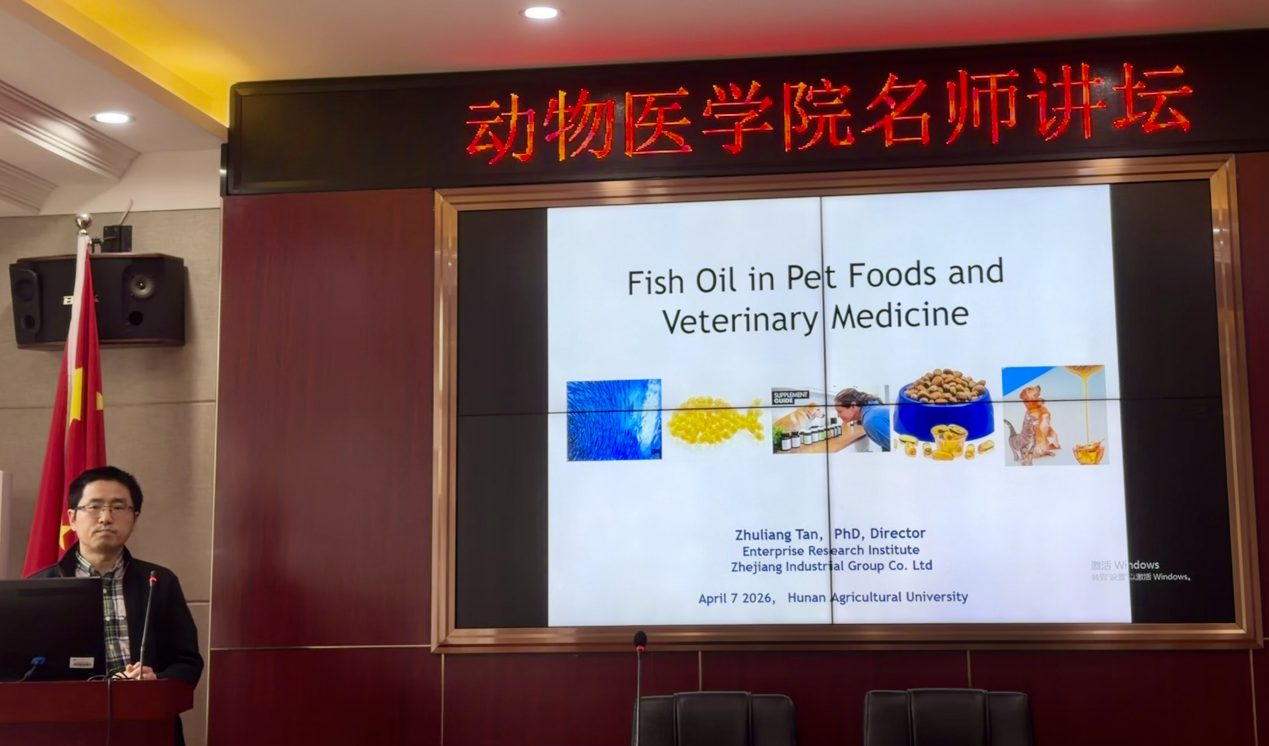 4月7日上午,由研究生院、校科协、动物医公司联合主办的“名师讲坛”在三教303会议室开讲。浙江舟山兴业集团有限公司企业研究院经理谭柱良研究员受邀作题为《Fish Oil in Pet Foods and Veterinary Medicine》的学术报告。本次报告由365英国上市集团经理易金娥教授主持。